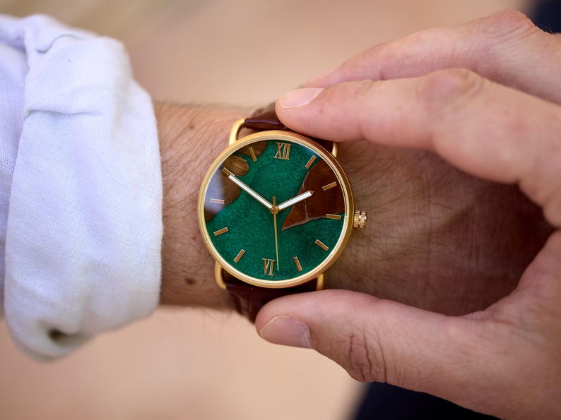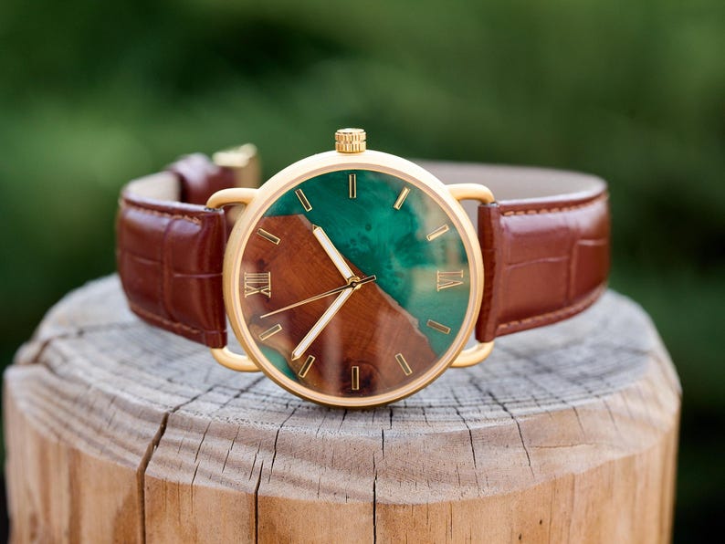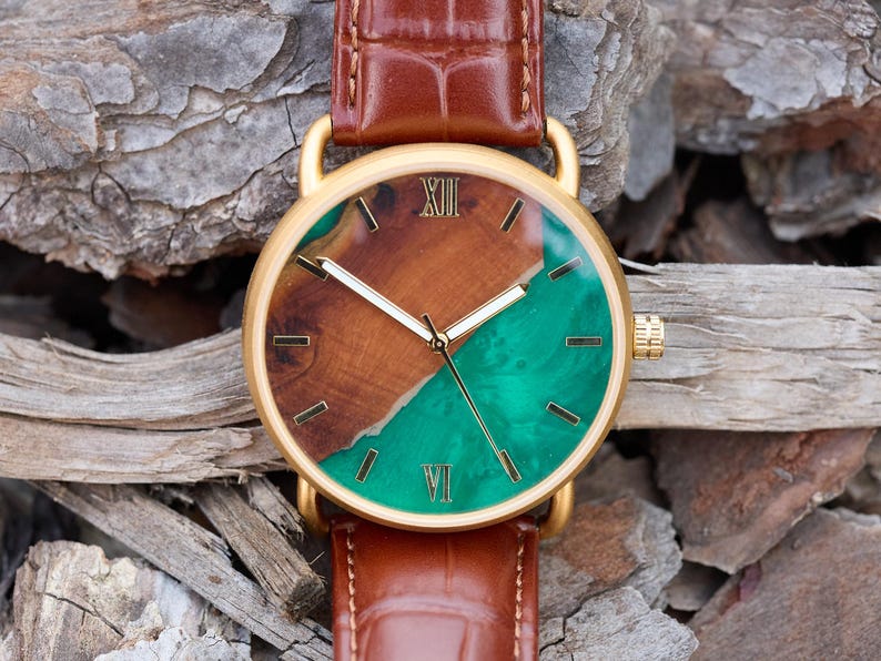 If you're looking for a thoughtful, unique, and high quality personalized gift for him, this Engraved Watch is just perfect. This beautiful watch is handcrafted from olive wood and epoxy resin and features a genuine leather strap, giving it a one-of-a-kind look and feel.