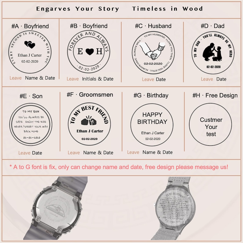 We offer 3 fonts, you can choose the one you like, and also you can send us your like fonts with design, please consider the size on watch back or Watch box.
